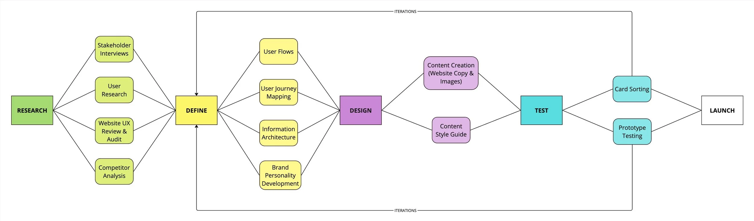 During this phase, I identified the need to understand each service offering’s workflow to determine what information to place on the website and where. However, due to the lack of online conversions, I found there was no standardized workflow for online service purchases. To address this, I interviewed staff to understand their work processes from client acquisition to delivery. I engaged all relevant teams in cross-departmental meetings to establish a cohesive workflow. This standardized workflow, combined with insights from the research phase, helped shape the final information architecture. Furthermore, the insights gotten provided a foundation for crafting transparent copy that guides website visitors on what to expect at each stage of their journey.